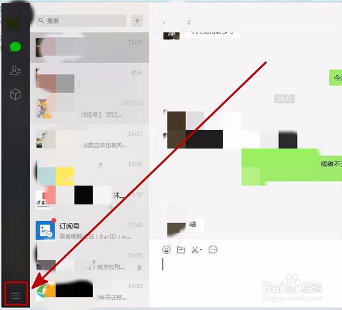 1、我們打開微信電腦版,默認(rèn)的是在聊天界面,我們可以看到左下角有一個(gè)“三”形狀的圖標(biāo),我們點(diǎn)擊。