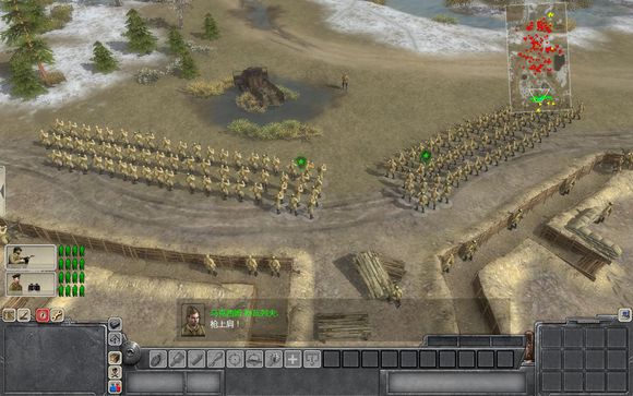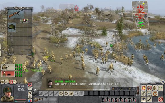 這是場(chǎng)面十分火爆的人海rush關(guān),可以欣賞到蘇軍的人海戰(zhàn)VS對(duì)德軍的裝甲精英戰(zhàn)的精彩對(duì)決。本關(guān)開始給你很多兵,可能在控制上會(huì)有點(diǎn)亂,注意分好隊(duì),不要一起沖,記住保存有生力量。然后在嗚拉聲中,沖鋒開始了。先讓友軍在前面沖鋒吸引火力,你在后面用零打碎敲的戰(zhàn)術(shù)把敵人的機(jī)槍點(diǎn)和火炮陣地一一拿下。先拿下地圖左側(cè)山頭的一門火炮,然后移動(dòng)到合適位置對(duì)準(zhǔn)敵軍的中央陣地炮轟,撥掉火力點(diǎn)和裝甲車輛。接著拿下右側(cè)的敵人的火炮陣地,最后突破敵軍中央陣地,右側(cè)有一輛坦克可以修好使用。