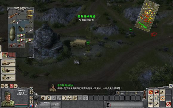 開始遇到一輛德國(guó)裝甲巡邏車,消滅它,在前方遇到一名軍官,會(huì)命令你去召喚士兵加入敢死隊(duì),趕到戰(zhàn)壕邊上單擊那里的士兵,將他們召入隊(duì)伍。之后任務(wù)提示搶奪一輛被打壞履帶的蘇軍坦克,將坦克修理好后,向前殺入德軍陣地,經(jīng)過(guò)一番戰(zhàn)斗,將德軍陣地上的敵人消滅干凈。然后任務(wù)提示要你渡過(guò)木橋去消滅一支德國(guó)運(yùn)輸隊(duì)。采步坦結(jié)合的戰(zhàn)術(shù),小心推過(guò)木橋,用高爆彈干掉山坡上的兩門反坦克炮,火速趕到山頭狙擊敵人車隊(duì)。最好先將燃油車打爆把路堵住,讓步兵負(fù)責(zé)坦克的周邊警戒,直接控制坦克打車隊(duì),消滅完車隊(duì)后過(guò)關(guān)。