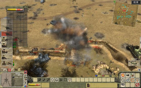 本關(guān)只給你三輛坦克,其中有兩輛還是只能打高爆彈的廢柴。注意小地圖敵人的來(lái)襲位置,親自控制火炮用穿甲彈先打敵人坦克。我方的火炮不要放在空曠地方,盡量放在掩體后,否則很容易被打壞。也可以到車站的箱子里找地雷,埋在敵人出兵位置,可以減少對(duì)抗烈度。用兩輛廢柴坦克對(duì)付敵軍士兵,重型坦克扮演消防隊(duì)角色,哪里有坦克就到那里去,不過(guò)要注意重型坦克的汽油不多,有空從廢柴坦克上抽點(diǎn)油給它。
