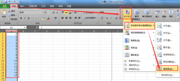 office2007怎么把相同數(shù)據(jù)標黃?1、選中該列內(nèi)容,點擊開始——條件格式——突出顯示單元格格式——重復值;