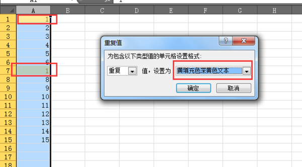 2、在彈出選項卡中設置重復值顯示顏色就行。