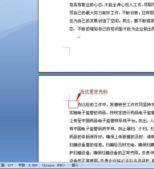 1、打開一個word文檔,在要開始設置頁碼的那一頁前面設置光標,將光標設置到那一頁的最前面,如圖所示,小編從第二頁開始設置。