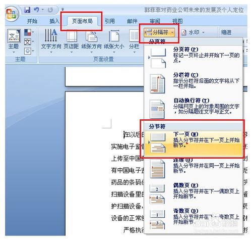 2、點擊上面菜單欄的頁碼布局,選擇分隔符,選擇下面的分節(jié)符,再選擇下一頁。
