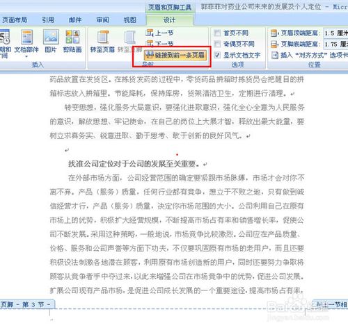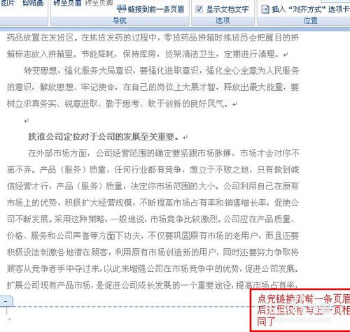 5、文檔會出現(xiàn)頁眉頁腳,在上面頁眉頁腳的菜單中選擇轉至頁腳,光標到了頁腳處,再點擊鏈接到前一條頁眉。此時文檔頁眉頁腳右邊的字(與上一節(jié)相同)消失。點擊保存。
