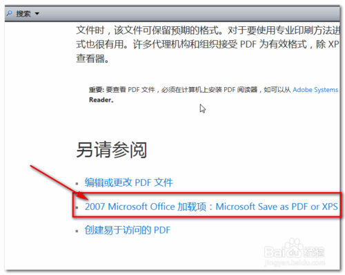 在文章未尾”另請參閱“欄目下找到“2007 Microsoft Office 加載項:Microsoft save as PDF or XPS“點擊并打開相應頁面(自動打開瀏覽器,并跳轉到Microsoft的官方下載頁面)