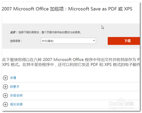4、在下載頁面找到2007 Microsoft Office 加載項:Microsoft save as PDF or XPS,選擇相應語言 ,然后點擊下載。