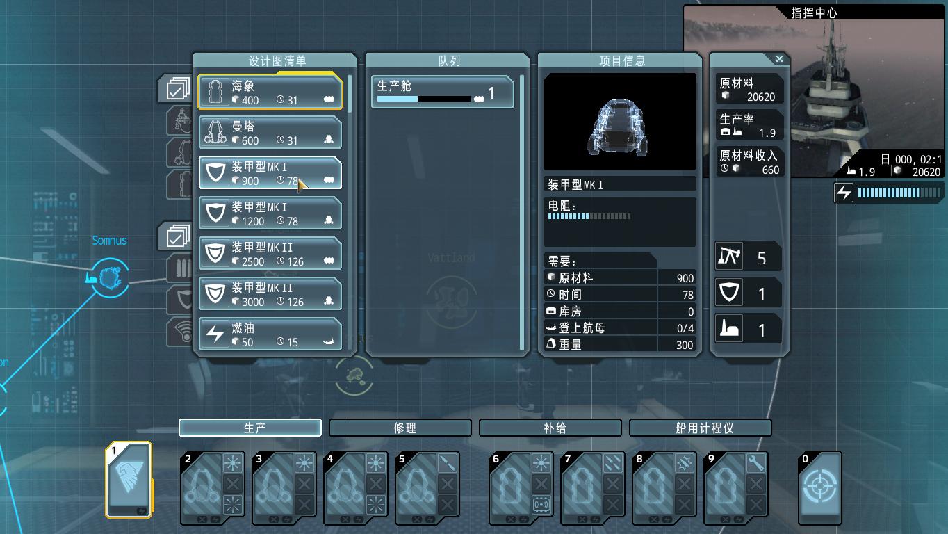 這里開始可以建造裝備和載具,造好的如果距離航母很遠,會自動用潛艇運到航母所在島嶼。