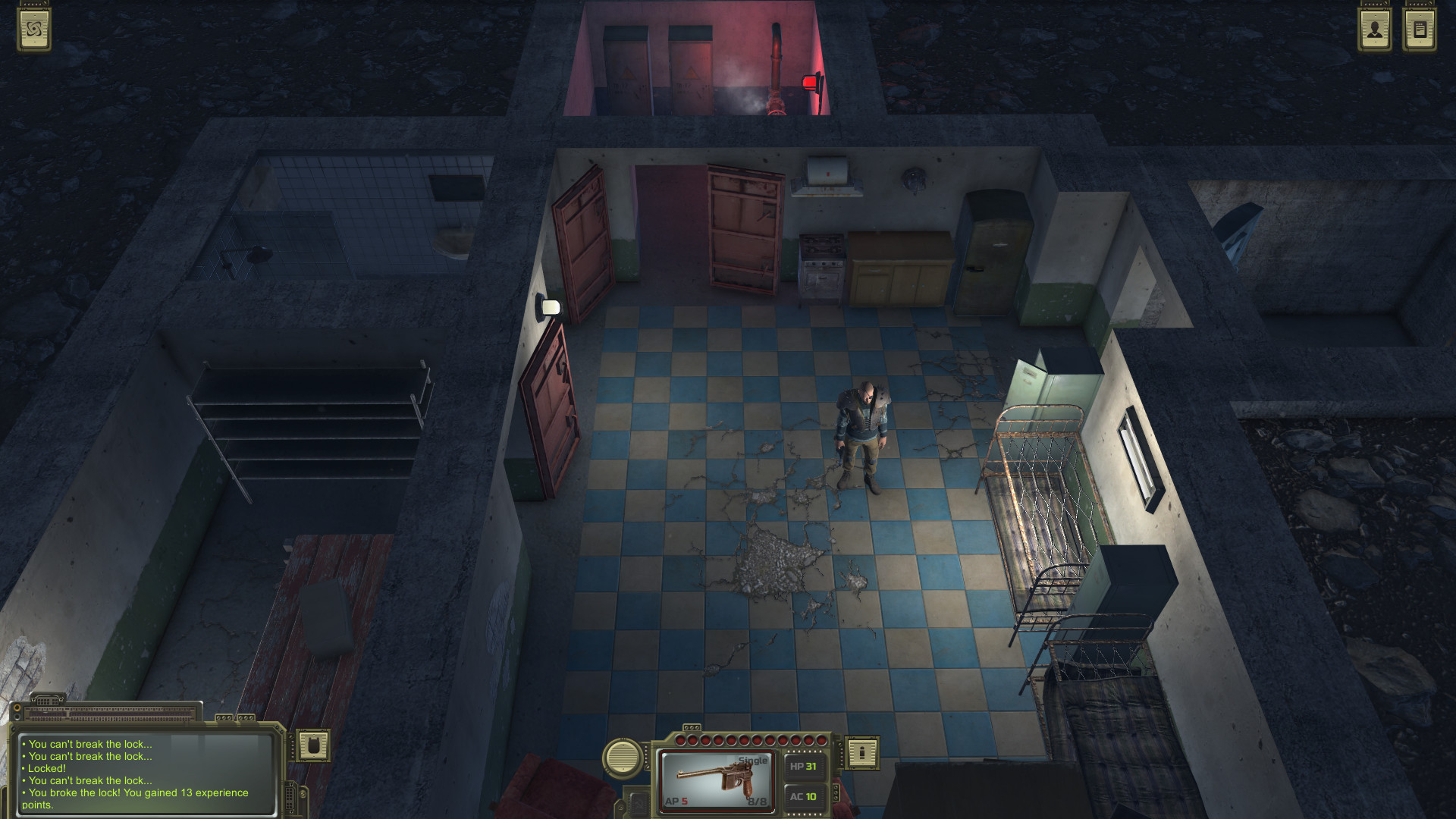 初期建議將敏捷,撬鎖,偷竊,潛行的技能點(diǎn)加高,雖然撬鎖是一種敵對(duì)行為,但是很明顯這是取得物資效率最高的一種方式,在獲取槍械之前能避免的戰(zhàn)斗就避免。商店每過一段時(shí)間會(huì)更新,不過要好的武器還是要通過升級(jí)做任務(wù)入手。