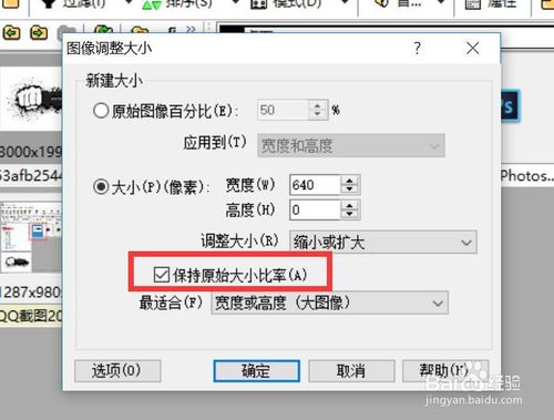 3、在彈出來的窗口中進(jìn)行設(shè)置。填上你要的寬度或高度,不用都寫(容易變形),記得勾選保持比率