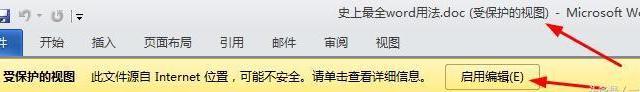 如果打開(kāi)從網(wǎng)絡(luò)上下載的文檔,Word 2010會(huì)自動(dòng)處于保護(hù)模式下,默認(rèn)禁止編輯,想要修改就得點(diǎn)一下“啟用編輯”即可。大概是出于版權(quán)保護(hù)的考慮吧。