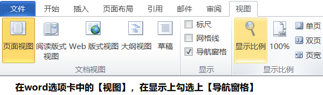 1、單擊【視圖】選項(xiàng)卡,在【顯示】組中勾選上【導(dǎo)航窗格】復(fù)選框打開(kāi)【導(dǎo)航】任務(wù)窗格。操作圖片如下