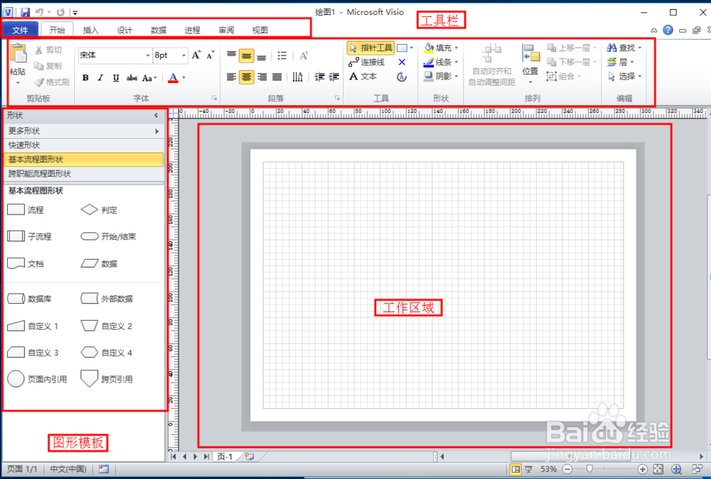 創(chuàng)建好后 我把這里分為三大區(qū)域介紹了 分別為:基礎(chǔ)模板區(qū),工具欄,和工作區(qū)域 接下來我們通過創(chuàng)建一個簡單的流程圖 詳細說明一下