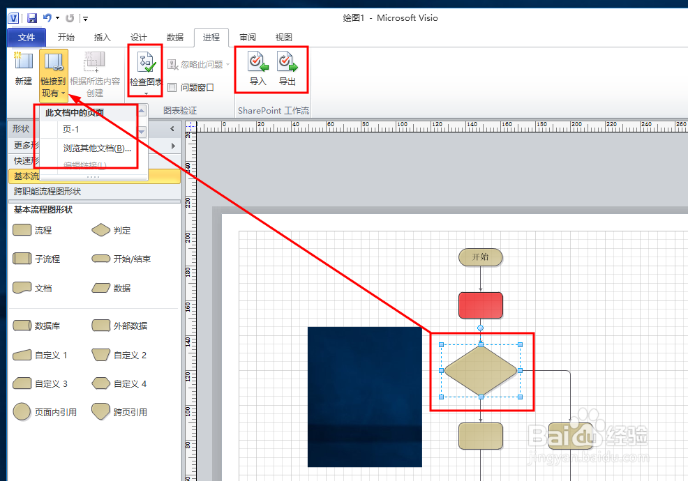 在進程界面 選中一個框后 即可將其連接到其他的頁面等, 也可以檢查圖表或者導(dǎo)入導(dǎo)出工作區(qū)表