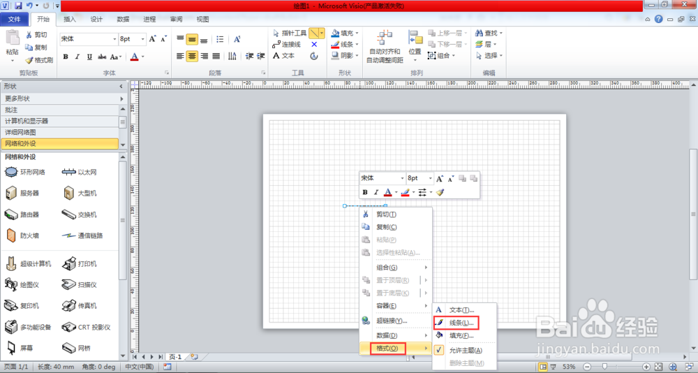 在繪制的直線上點擊鼠標右鍵,彈出下拉菜單,找到格式選項,點擊格式,彈出格式下拉菜單,找到線條選項。如下圖所示。