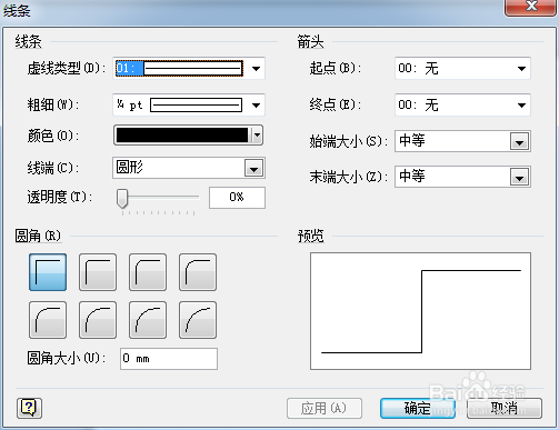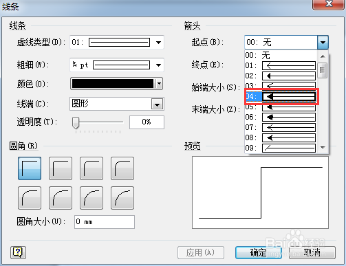 通過線條對話框設(shè)置起點,終點的形式,如下圖所示。