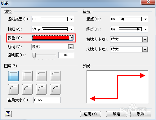 通過線條對話框設(shè)置始端,末端箭頭大小。如下圖所示。