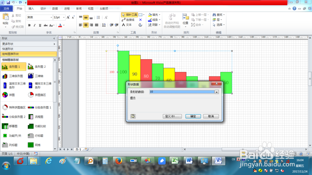 鼠標點住左側(cè)【圖表和圖形形狀】中的條形圖對象,并拖動到右側(cè)的主窗口中,然后設(shè)置條形數(shù)量,比如12,然后點擊【確定】