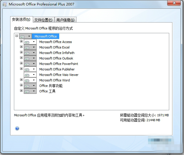 Office2007官方免費(fèi)完整版安裝教程:安裝2007office軟件下載版時(shí)可進(jìn)行自定義的安裝,點(diǎn)擊“自定義”即可。在自定義的安裝界面中包含3個(gè)選項(xiàng)卡,分別為:安裝選項(xiàng)、文件位置和用戶信息三部分。