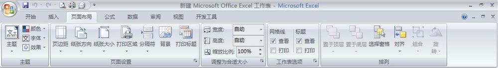 “頁面布局”——主題”、“頁面布局”、“調(diào)整為合適大小”、“工作表選項(xiàng)”、“排列”的使用: