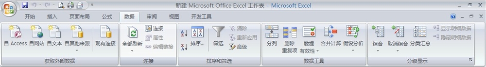 “數(shù)據(jù)”工具欄:將光標(biāo)移動(dòng)到“數(shù)據(jù)”的位置,右擊鼠標(biāo),我們就能看到“獲取外部數(shù)據(jù)”、“連接”、“排序和篩選”、“數(shù)據(jù)工具”、“分級(jí)顯示”。