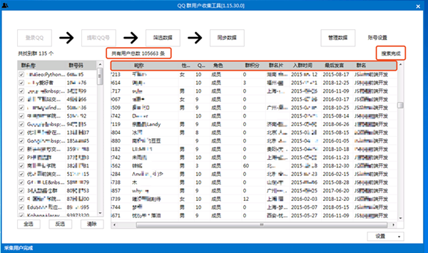 軟件自動(dòng)過濾重復(fù)QQ,性別、入群時(shí)間、發(fā)言時(shí)間、積分、Q齡這些都能提取。