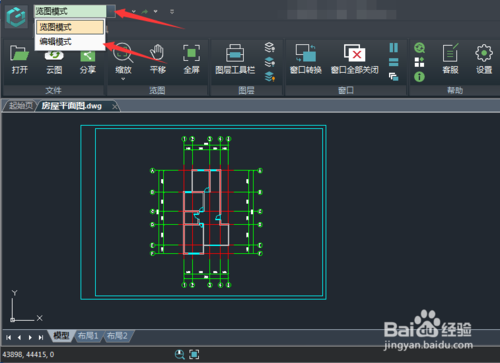 打開之后的圖紙只能移動和放大縮小查看圖紙,那么,在左上角點覽圖模式下拉三角選擇編輯模式。