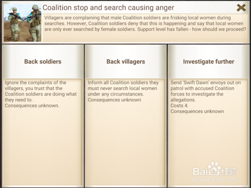 一旦開始派遣軍對去圍剿叛軍,就會出現(xiàn)各種問題。比如當(dāng)?shù)鼐用窨馗媛?lián)盟士兵強奸婦女,空軍會誤傷居民。留點資金在手上,以防隨機事件出現(xiàn),尤其是當(dāng)這些事件需要你花錢才能獲得最佳結(jié)果。