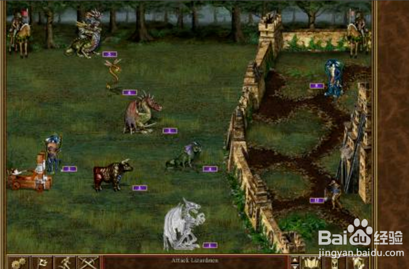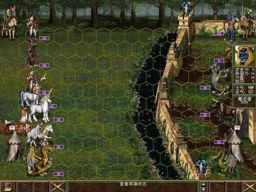 首先進(jìn)入戰(zhàn)斗后需要讓你排兵步陣,其實(shí)就是3代的戰(zhàn)術(shù)拉,當(dāng)你排好陣型,點(diǎn)右下一只手拿把劍的選單開始戰(zhàn)斗畫面魔法或者技能(關(guān)于兵種擁有特級或魔法,都得依靠此進(jìn)行)投降或逃跑選項(xiàng)設(shè)置自動戰(zhàn)斗等待防御我框住的地方是行動順序,然后畫面中,我鼠標(biāo)指向了敵人,顯示出了敵人的行動步數(shù),意思是下次他行動后能走多遠(yuǎn)