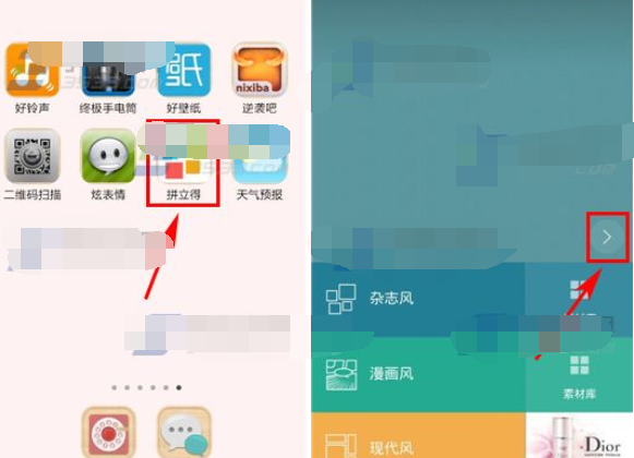 1、打開手機(jī)桌面中的拼立得圖標(biāo),在首頁中選擇喜歡的風(fēng)格,點(diǎn)擊選擇雜志風(fēng)