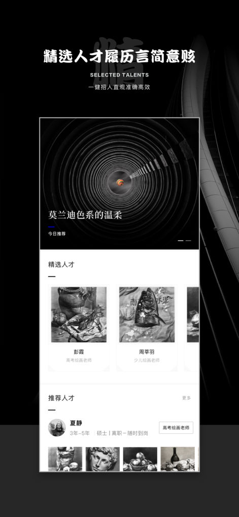 海量的美術(shù)、舞蹈、音樂優(yōu)才在這里等你,誠摯的BOSS在這里等你,海量高薪職位實時更新,薪資透明,直接和老板談,求職者與招聘方精準(zhǔn)匹配,招聘更專業(yè),求職更快捷。