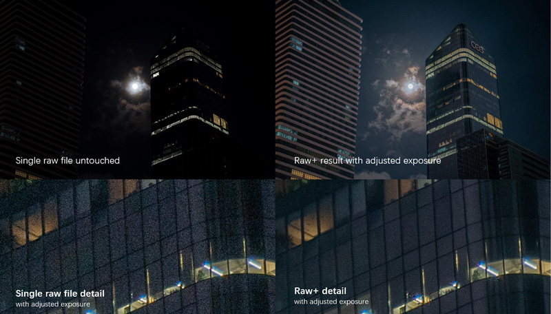 (1)把12、14bit位深的Raw原始圖片,提升成為16bit的DNG圖片,提供更大后期空間。(2)弱光下降噪效果明顯,多張連拍的照片疊加沒有“鬼影”或者模糊,特別是在場(chǎng)景中有運(yùn)動(dòng)物體的時(shí)候。