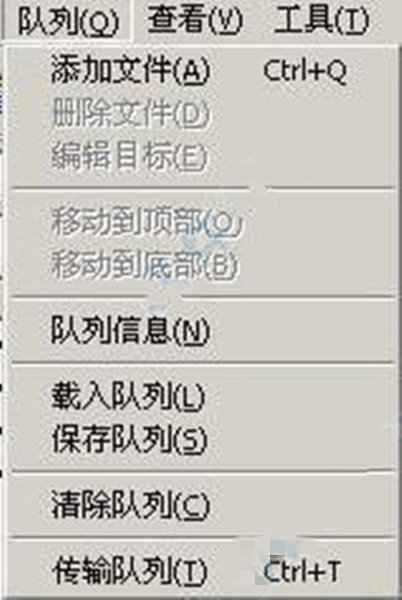 隊列管理就是對所傳輸?shù)奈募澳夸涍M(jìn)行的一些功能設(shè)置,包括隊列的保存,載入、清除、恢復(fù)和傳輸?shù)?,可以說是比較重要的功能。通過菜單【隊列】我們就可以進(jìn)行隊列的相關(guān)操作。