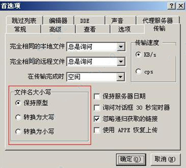文件大小寫轉(zhuǎn)換就是在傳輸文件時,強(qiáng)制把要傳輸?shù)奈募凑招枰M(jìn)行大小寫的改變。這對于大小寫敏感的UNIX系統(tǒng)非常有用。通過菜單【選項】—>【偏好設(shè)置】—>【常規(guī)】的傳輸選項卡,我們就可以實現(xiàn)文件名大小寫轉(zhuǎn)換。