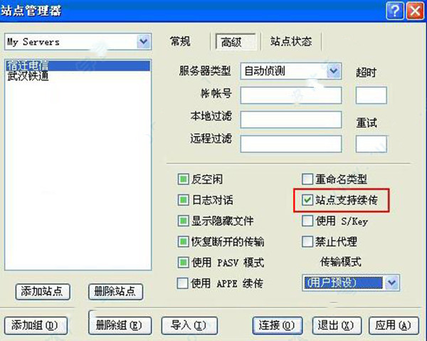 打開leapftp,打開站點管理器,選中一個站點名稱,在右半部分選“高級”選項,然后勾選“站點支持續(xù)傳”,點擊“應(yīng)用”,這樣就可以了。比較麻煩的是每個站點都要如此設(shè)一次。