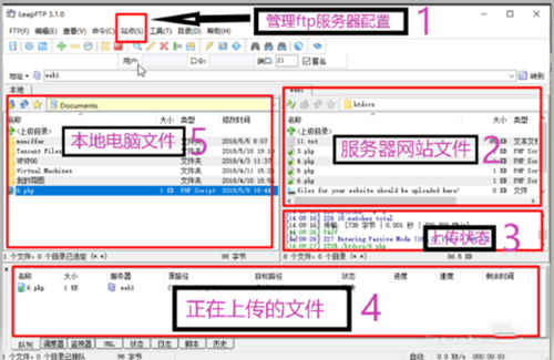 2、運行 LeapFTP,點擊1處(站點-》站點管理器),彈出“站點管理器”窗口;在2處選擇“My Servers”項,然后在3處點擊“添加站點”按鈕,在彈出的窗口4處輸入您喜歡的站點名稱(如:mysite);