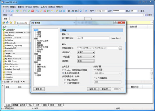 所謂反空閑或者說閑置保護(hù)功能就是讓計算機(jī)在空閑狀態(tài)下每隔一段時間向FTP服務(wù)器發(fā)送一段特定指令,以便讓FTP服務(wù)器知道自己還是活動的,從而避免FTP服務(wù)器斷開對自己的連接。通過菜單【選項】—>【偏好設(shè)置】—>【常規(guī)】的高級選項卡我們就可以設(shè)置相關(guān)的參數(shù)。