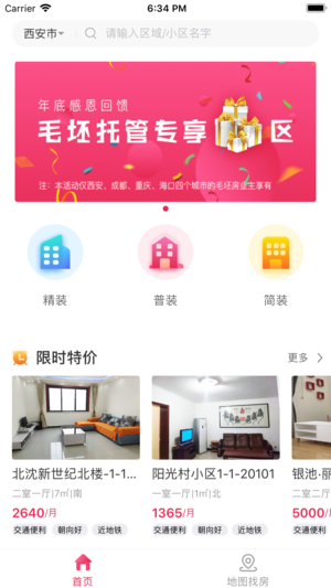 首頁(yè):消費(fèi)者可以根據(jù)城市查找不同裝修類型的房屋,并可以看到最新發(fā)布的房源,特價(jià)房源,推薦房源。