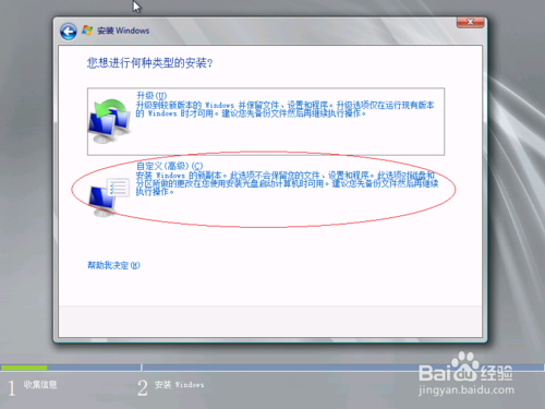 5、選擇安裝類型為自定義(高級),此為全新安裝Windows Server 2008 R2操作系統(tǒng);如果選擇升級,則是從低版本升級到Windows Server 2008 R2操作系統(tǒng)。如圖,你可根據(jù)需要而定。
