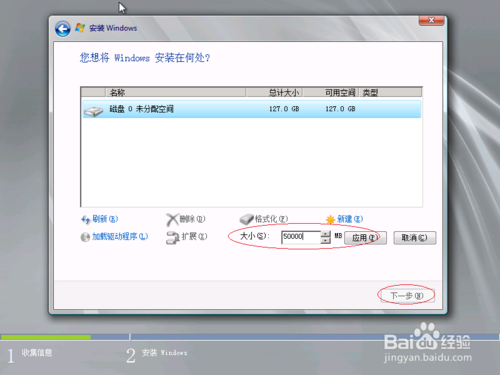 8、分配磁盤分區(qū)大小,點擊應用。當然硬盤夠大分區(qū)容量還可擴大,建議至少分配50G。
