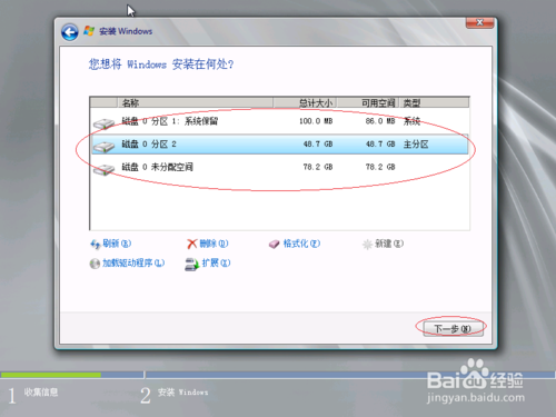9、選擇安裝Windows Server 2008 R2 x64企業(yè)版的分區(qū),一般都是選擇第二個分區(qū)即C:盤,第一個分區(qū)為系統(tǒng)保留分區(qū)。如圖,選擇完畢點擊下一步。