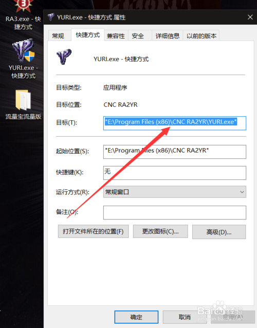 然后在快捷方式欄 ,目標后加加-win 即用窗口運行即可。例如D:\danjiGAME\101010321\yuri2\YURI.exe -speedcontrol -win
