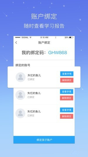 家長通過云學(xué)社app綁定孩子賬戶查看學(xué)情。