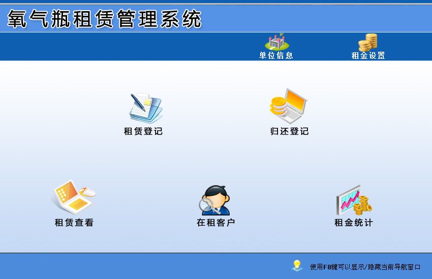《氧氣瓶租賃管理系統(tǒng)》是專為氣站租賃行業(yè)做的一款軟件。軟件主要集租賃、歸還、租金統(tǒng)計等功能與一體。軟件操作簡單,易學、易用,界面設計簡潔、美觀其人性化的管理可以使您輕易上手,該軟件將是您明智的選擇。 《氧氣瓶租賃管理系統(tǒng)》包含如下功能: 基本信息:單位信息、租金設置 業(yè)務管理:租賃登記、歸還登記、租賃查看、在租客戶、租金統(tǒng)計