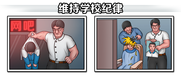 要保證升學(xué)率,維持紀(jì)律是重要的手段。學(xué)校里的每一個(gè)學(xué)生都有自己的行為模式,他們會(huì)上課睡覺(jué),看漫畫(huà),聽(tīng)音樂(lè),理洗剪吹發(fā)型,在廁所里抽煙,翻墻去各種娛樂(lè)場(chǎng)所,甚至?xí)瓗徒Y(jié)伙去網(wǎng)吧開(kāi)黑。
