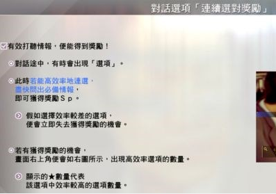此時進入對話選項。按正確的順序打聽情報,可獲得SP獎勵。