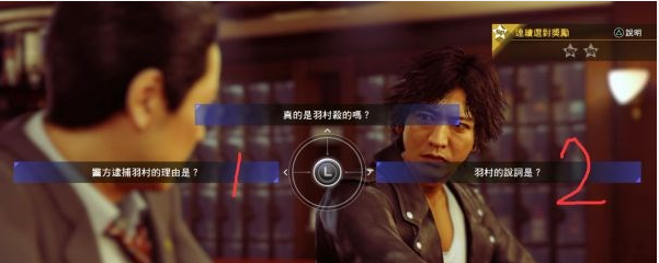 注意畫面左下角的提示,有時會比較有用。既然警方逮捕了羽村,首先要問警方的逮捕理由是什么,然后才是問羽村的說詞,故正確的選擇順序如下圖: