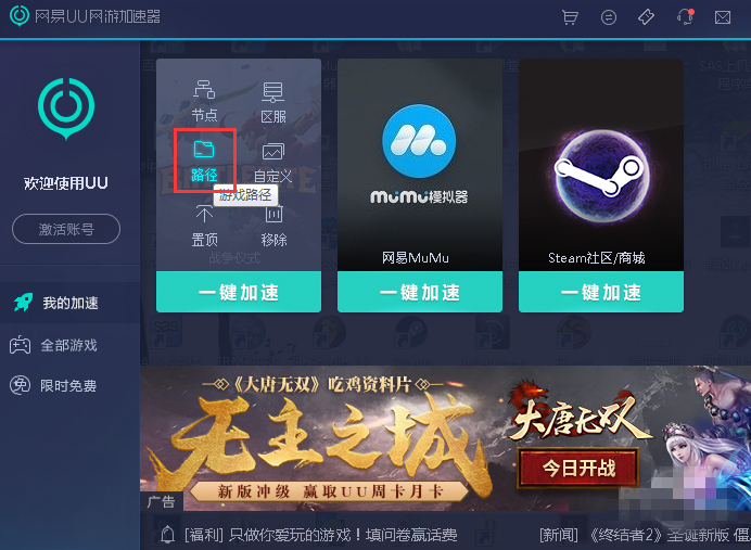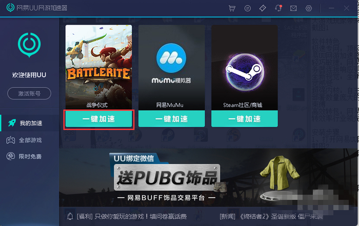 如何使用網(wǎng)易UU網(wǎng)游加速器加速游戲?1、打開網(wǎng)易UU網(wǎng)游加速器,點擊一鍵加速游戲即可