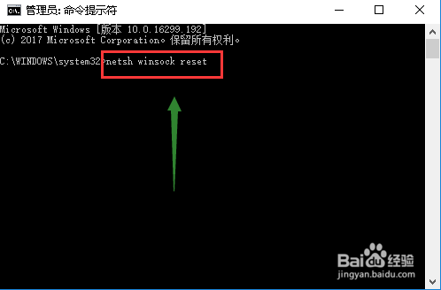 在命令窗口輸入netsh winsock reset回車,網(wǎng)絡(luò)會短暫斷開,重來就可以了,如下圖所示
