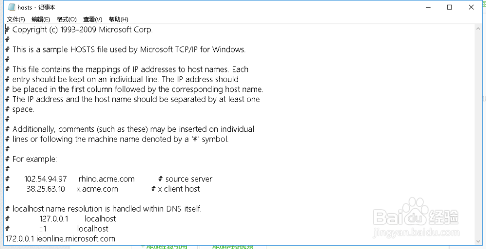 用記事本打開hosts文件,檢查結(jié)尾是否有被修改了,多余的要刪除,如下圖所示
